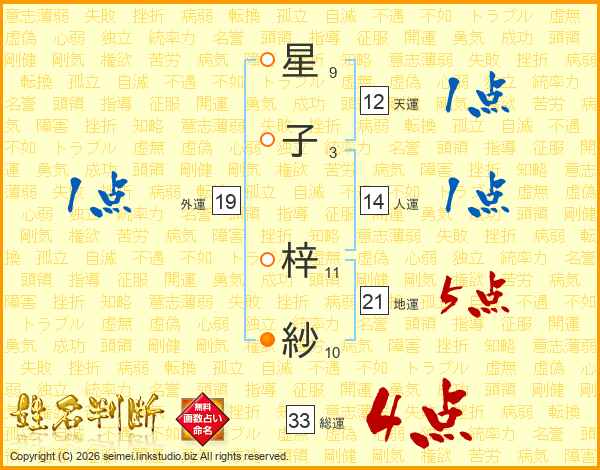 生活面を象徴する運勢です。外部から受ける影響力を表し、結婚運、家庭運や職場、環境への順応性を表します。総運から人運を引いた画数。姓や名が1文字の場合を除く。