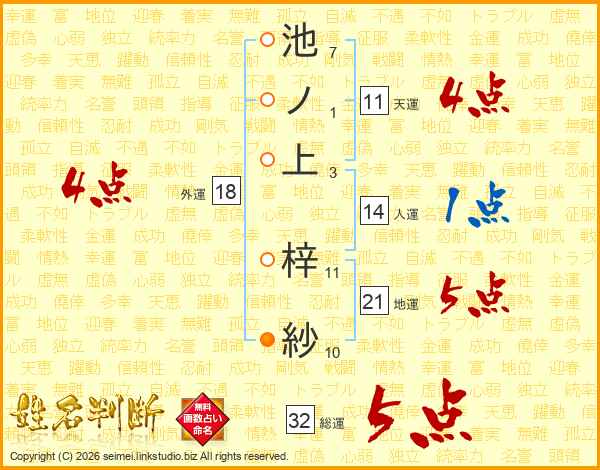 池(7画)ノ(1画)上(3画) 梓(11画)紗(10画)