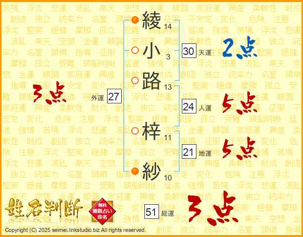 綾(14画)小(3画)路(13画) 梓(11画)紗(10画)