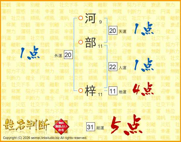 生活面を象徴する運勢です。外部から受ける影響力を表し、結婚運、家庭運や職場、環境への順応性を表します。総運から人運を引いた画数。姓や名が1文字の場合を除く。