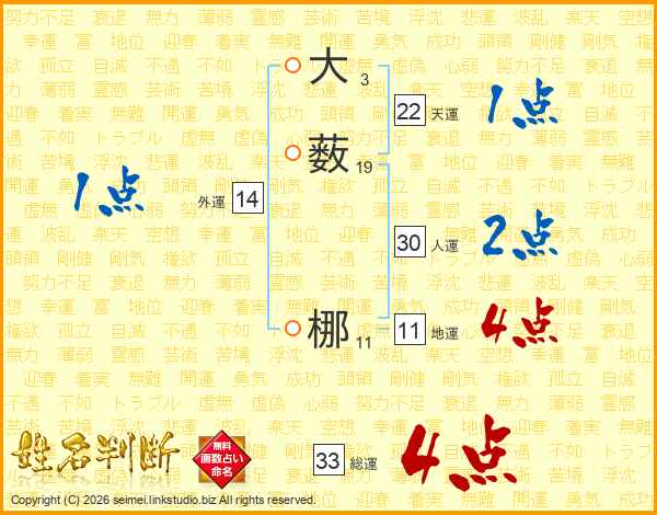 生活面を象徴する運勢です。外部から受ける影響力を表し、結婚運、家庭運や職場、環境への順応性を表します。総運から人運を引いた画数。姓や名が1文字の場合を除く。