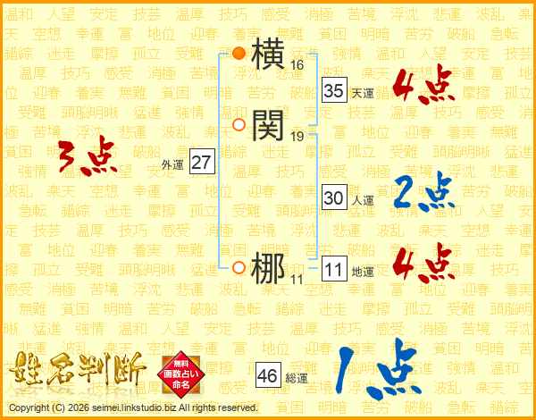 生活面を象徴する運勢です。外部から受ける影響力を表し、結婚運、家庭運や職場、環境への順応性を表します。総運から人運を引いた画数。姓や名が1文字の場合を除く。