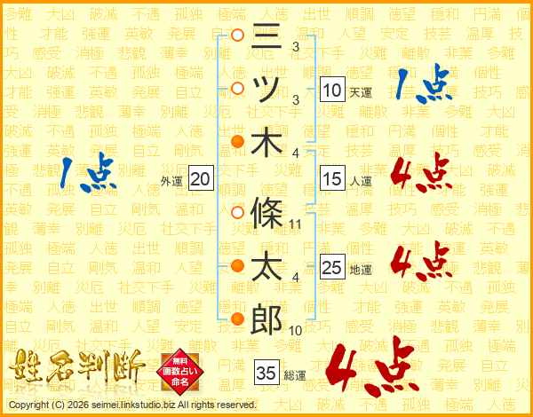三(3画)ツ(3画)木(4画) 條(11画)太(4画)郎(10画)