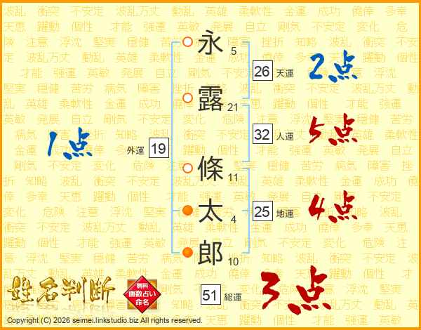 永(5画)露(21画) 條(11画)太(4画)郎(10画)
