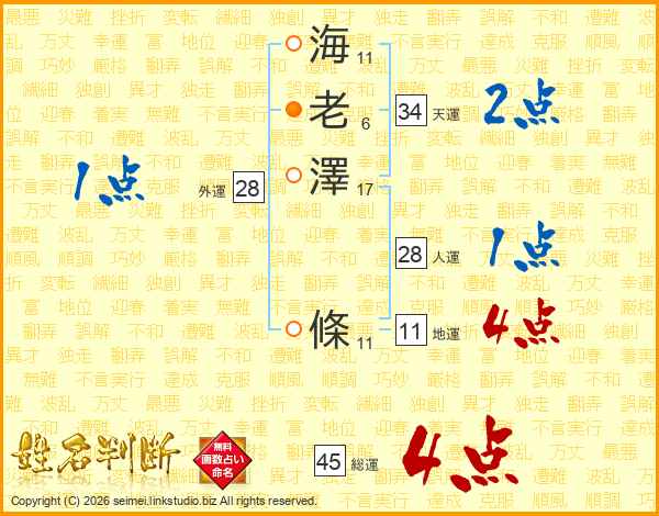 あなたの人生を表す1番重要な運勢です。生涯を通じて影響する総合運となり、主に50歳以降の晩年期に影響を及ぼします。苗字と名前の合計画数。