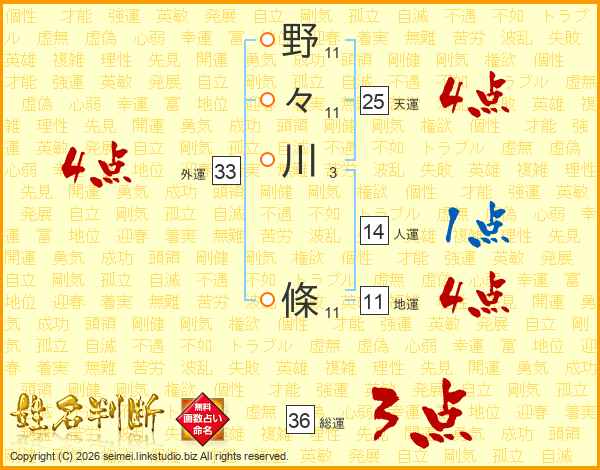 生活面を象徴する運勢です。外部から受ける影響力を表し、結婚運、家庭運や職場、環境への順応性を表します。総運から人運を引いた画数。姓や名が1文字の場合を除く。