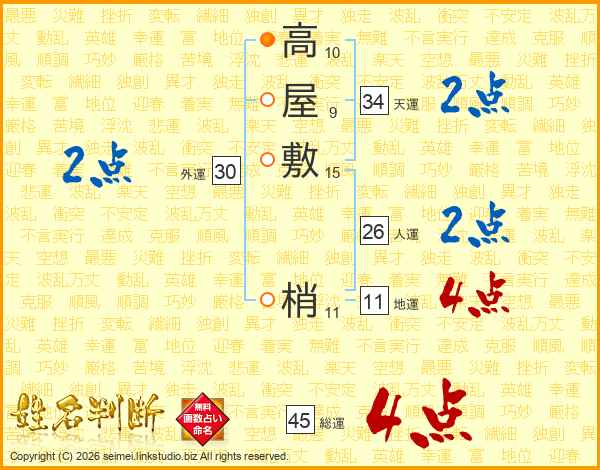 高(10画)屋(9画)敷(15画) 梢(11画)