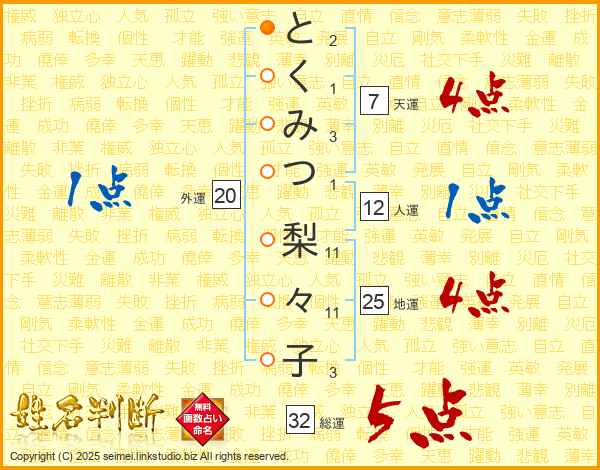 とくみつ梨々子さんの総運は32画の5点!