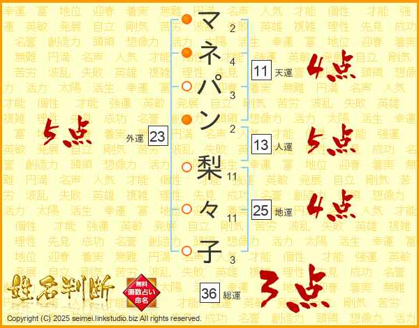 マ(2画)ネ(4画)パ(3画)ン(2画) 梨(11画)々(11画)子(3画)