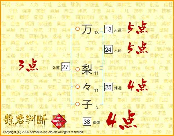 生活面を象徴する運勢です。外部から受ける影響力を表し、結婚運、家庭運や職場、環境への順応性を表します。総運から人運を引いた画数。姓や名が1文字の場合を除く。