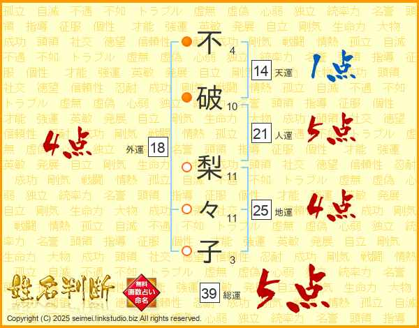 不(4画)破(10画) 梨(11画)々(11画)子(3画)