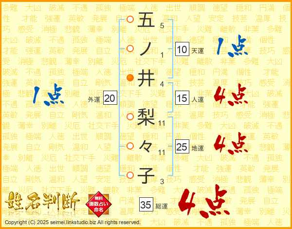 五(5画)ノ(1画)井(4画) 梨(11画)々(11画)子(3画)