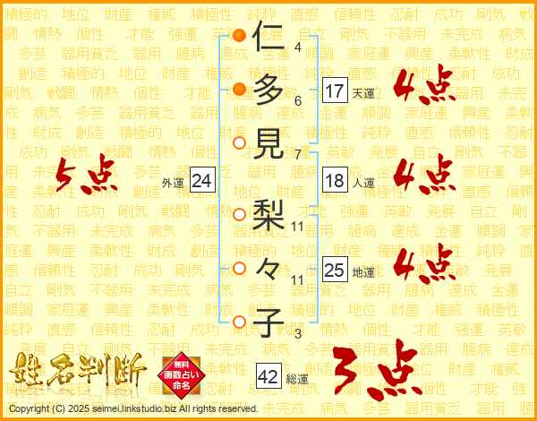 仁(4画)多(6画)見(7画) 梨(11画)々(11画)子(3画)