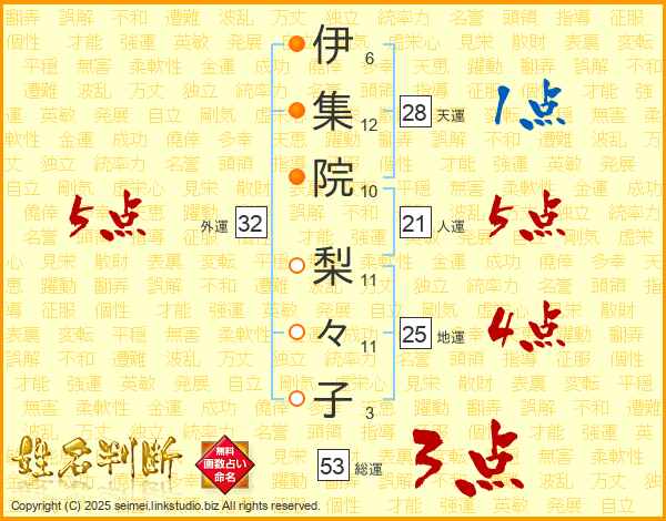 伊(6画)集(12画)院(10画) 梨(11画)々(11画)子(3画)