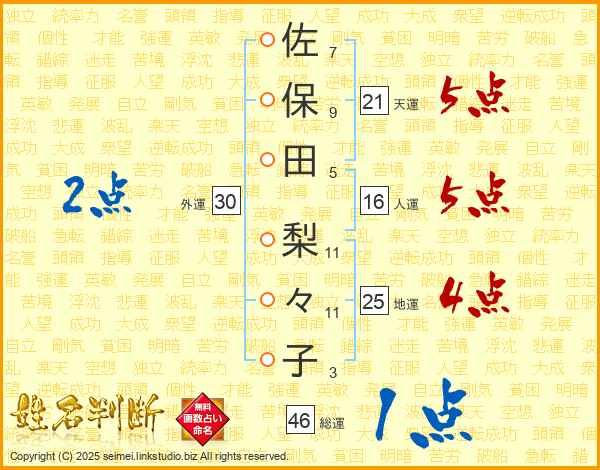 佐(7画)保(9画)田(5画) 梨(11画)々(11画)子(3画)