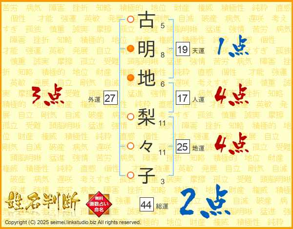 古(5画)明(8画)地(6画) 梨(11画)々(11画)子(3画)
