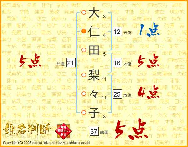 大(3画)仁(4画)田(5画) 梨(11画)々(11画)子(3画)