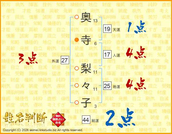 奥(13画)寺(6画) 梨(11画)々(11画)子(3画)