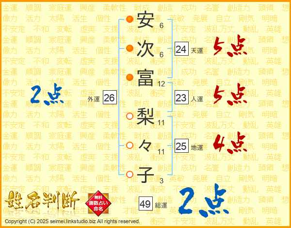 安(6画)次(6画)富(12画) 梨(11画)々(11画)子(3画)