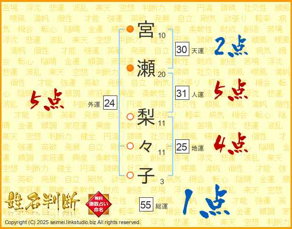 宮(10画)瀬(20画) 梨(11画)々(11画)子(3画)