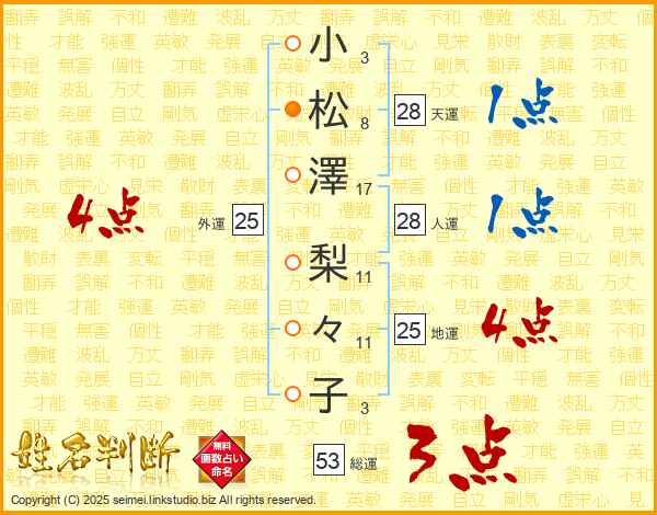 小(3画)松(8画)澤(17画) 梨(11画)々(11画)子(3画)