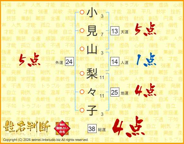 小(3画)見(7画)山(3画) 梨(11画)々(11画)子(3画)
