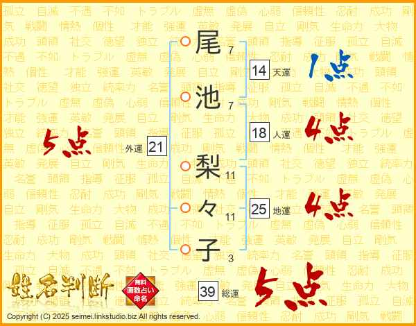尾(7画)池(7画) 梨(11画)々(11画)子(3画)