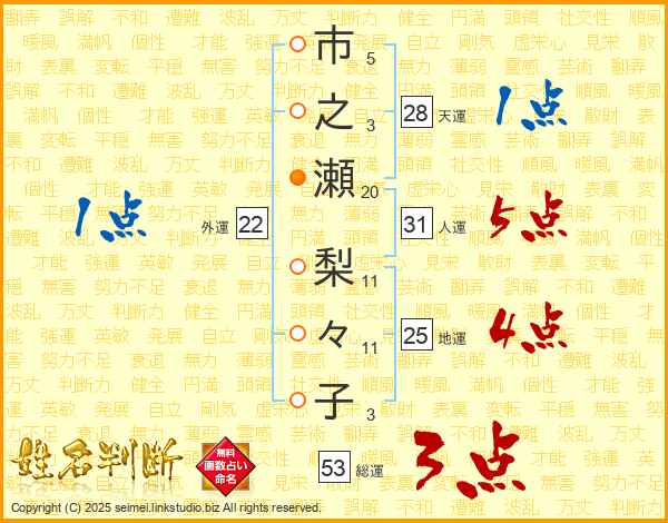 市(5画)之(3画)瀬(20画) 梨(11画)々(11画)子(3画)