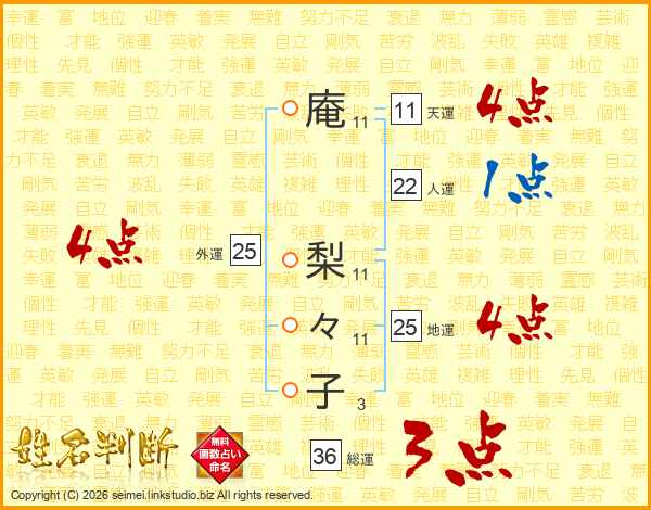 庵(11画) 梨(11画)々(11画)子(3画)