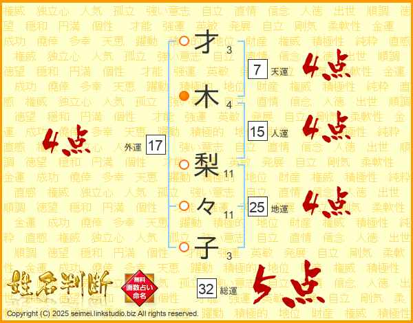 才(3画)木(4画) 梨(11画)々(11画)子(3画)