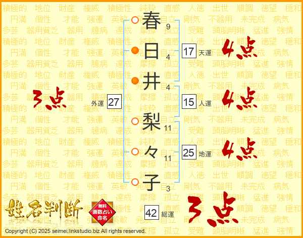 春(9画)日(4画)井(4画) 梨(11画)々(11画)子(3画)