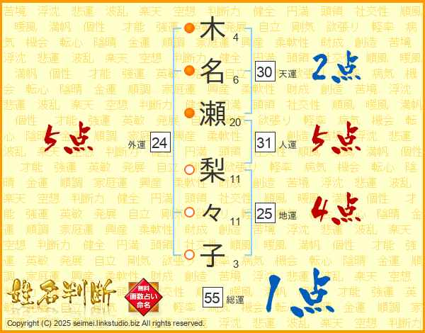 木(4画)名(6画)瀬(20画) 梨(11画)々(11画)子(3画)
