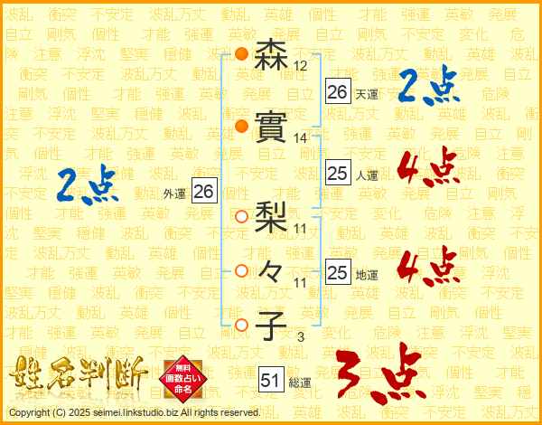 森(12画)實(14画) 梨(11画)々(11画)子(3画)