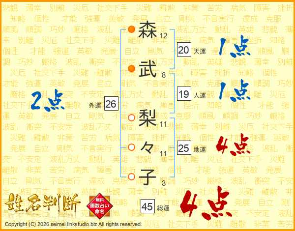 森(12画)武(8画) 梨(11画)々(11画)子(3画)