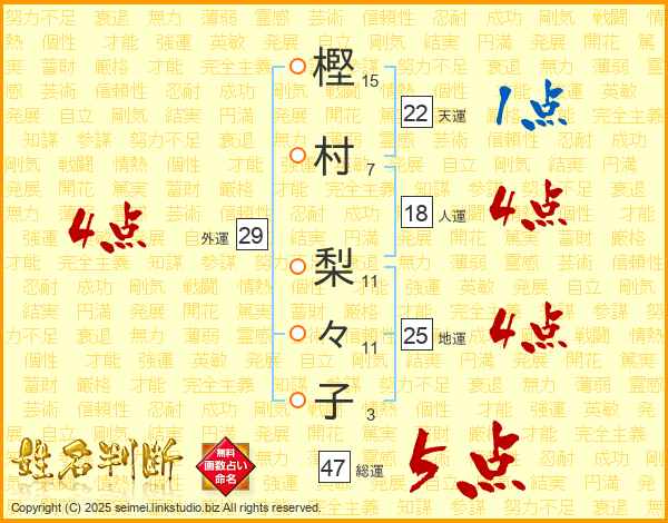 樫(15画)村(7画) 梨(11画)々(11画)子(3画)