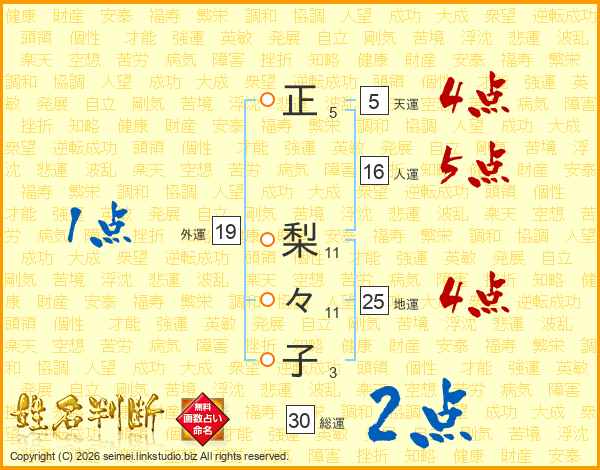 生活面を象徴する運勢です。外部から受ける影響力を表し、結婚運、家庭運や職場、環境への順応性を表します。総運から人運を引いた画数。姓や名が1文字の場合を除く。