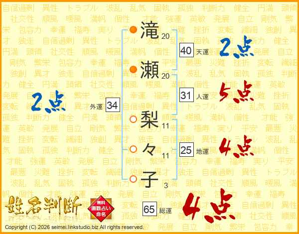 滝(20画)瀬(20画) 梨(11画)々(11画)子(3画)