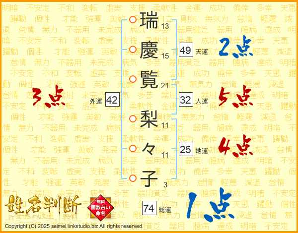 瑞(13画)慶(15画)覧(21画) 梨(11画)々(11画)子(3画)
