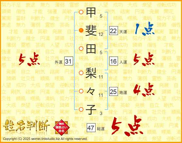 甲(5画)斐(12画)田(5画) 梨(11画)々(11画)子(3画)