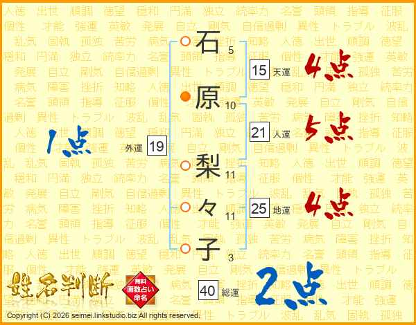 石(5画)原(10画) 梨(11画)々(11画)子(3画)