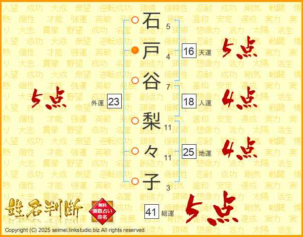石(5画)戸(4画)谷(7画) 梨(11画)々(11画)子(3画)