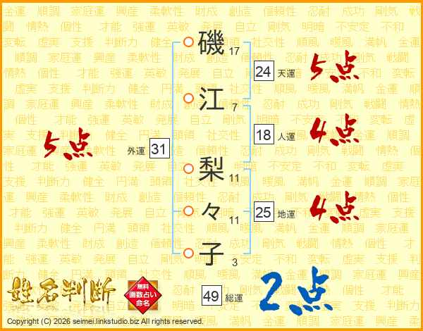 磯(17画)江(7画) 梨(11画)々(11画)子(3画)