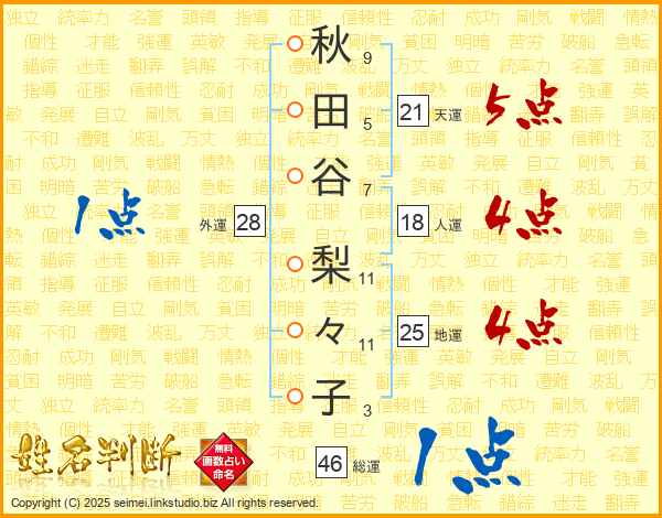 秋田谷梨々子さんの天運は21画の5点!