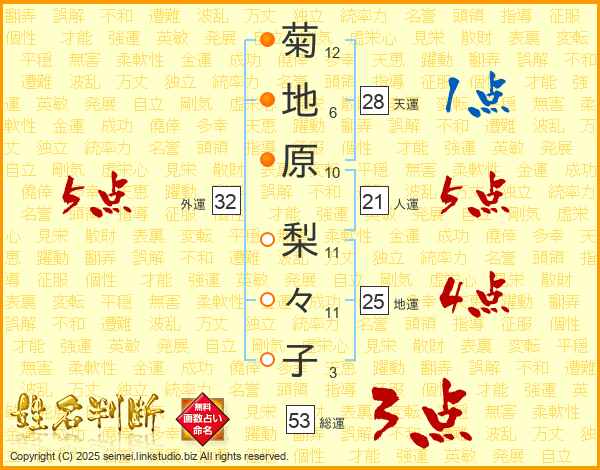 菊(12画)地(6画)原(10画) 梨(11画)々(11画)子(3画)