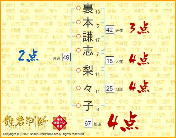 裏(13画)本(5画)謙(17画)志(7画) 梨(11画)々(11画)子(3画)