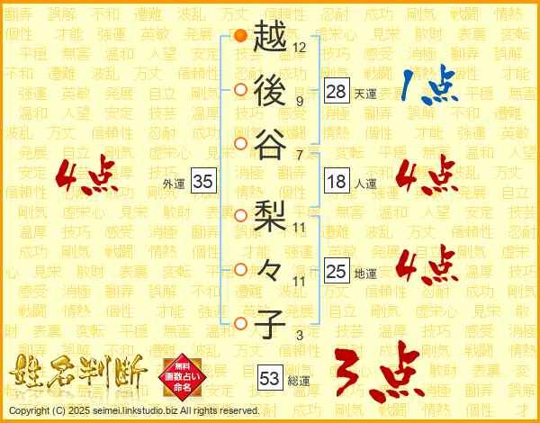 越(12画)後(9画)谷(7画) 梨(11画)々(11画)子(3画)