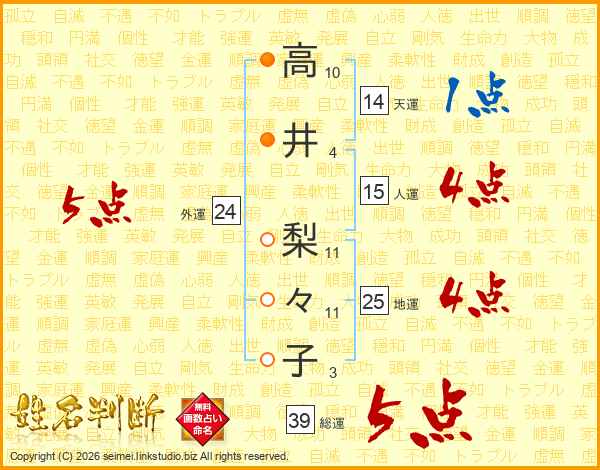 高(10画)井(4画) 梨(11画)々(11画)子(3画)