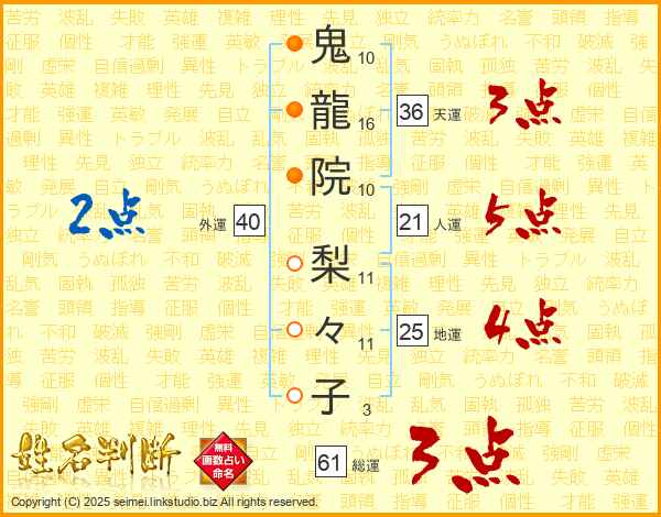 鬼(10画)龍(16画)院(10画) 梨(11画)々(11画)子(3画)