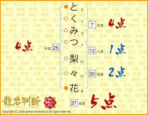 と(2画)く(1画)み(3画)つ(1画) 梨(11画)々(11画)花(8画)