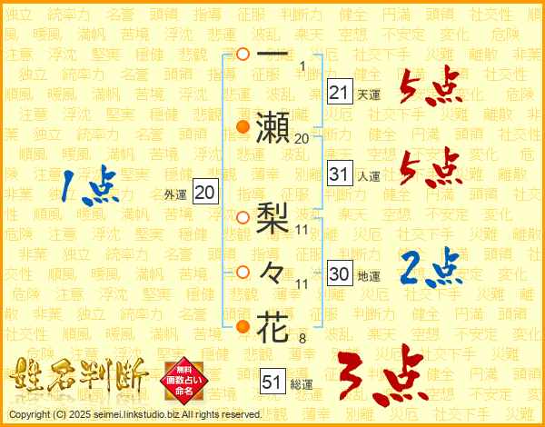 一(1画)瀬(20画) 梨(11画)々(11画)花(8画)